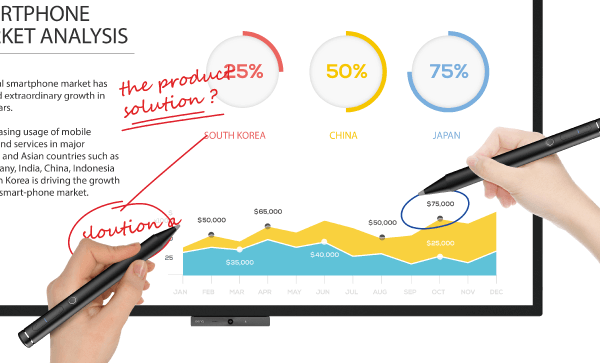 يأتي EZWrite 5 مع أقلام مزدوجة تسمح لمستخدمين بالكتابة أو الرسم في وقت واحد بألوان مختلفة، مما يجعلها مثالية لمقدمي العروض المتعددين