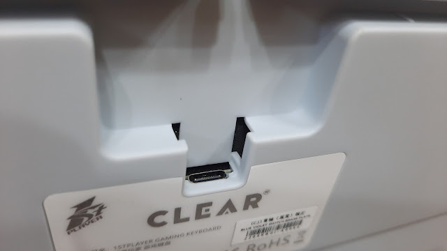 يوجد فتحة أدناه للسماح بوضع كابل لوحة المفاتيح القابل للفصل والملحقات الأخرى هنا. يوفر1STPLAYER هنا كابل USB من النوع A متناسق الألوان إلى كبل من النوع C. بالإضافة إلى أداة إزالة مفتاح على شكل حلقة معدنية، بالإضافة إلى ساحب keycap على شكل سلك معدني.